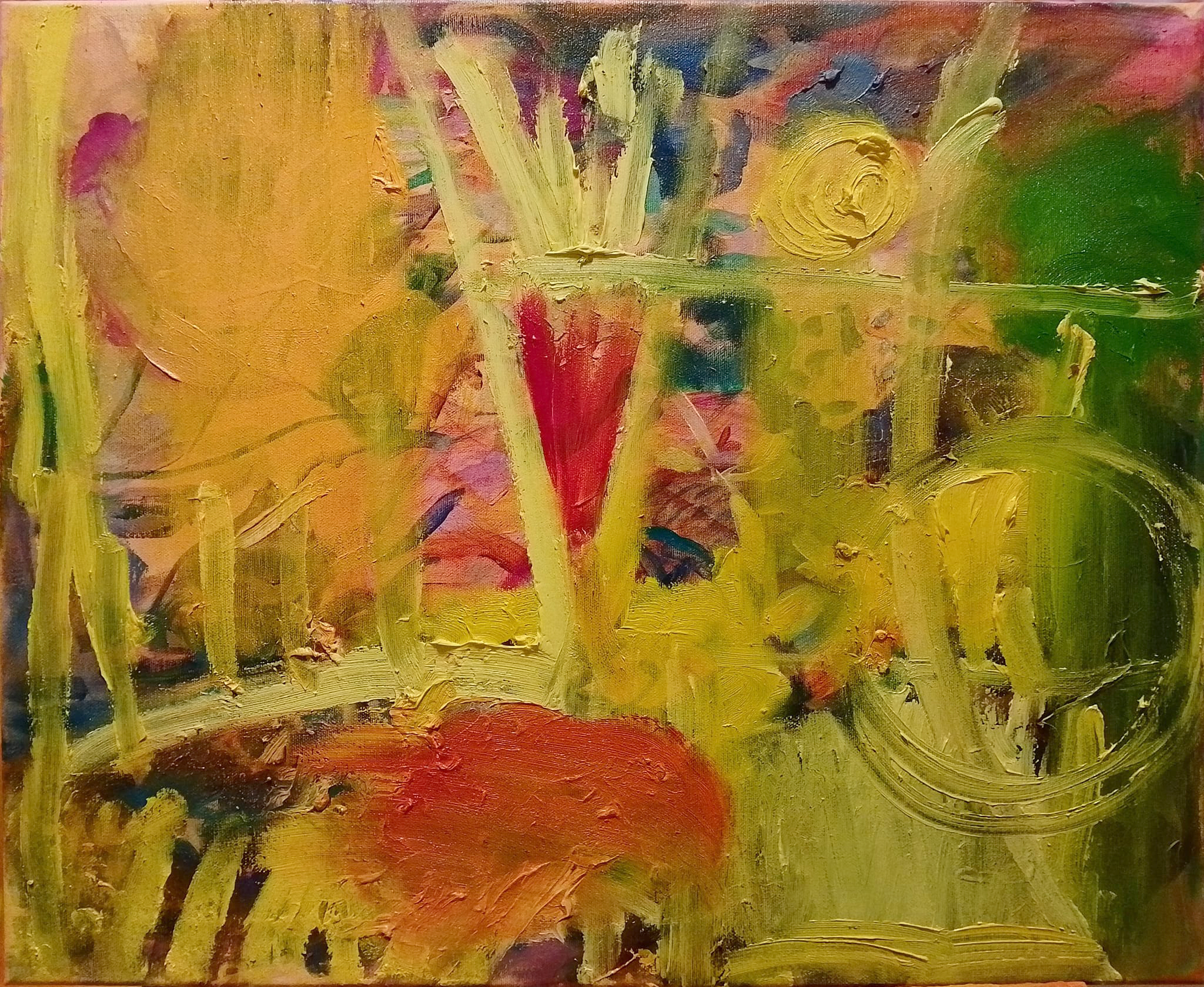 The experience leaves a mark and a vivid image that intensifies again at the moment of painting. I do not paint a specific visual image but an experience. Capturing it with colors is also a journey through time, involving memories of similar moments throughout life: as a child in Australia among evergreen trees with slightly grayish green, a trip in Singapore deep into the rainforest, a pause in the Finnish winter observing the clear armpits of young aspens in the home yard, carefully walking on rain-slick rocks on an islet in the Turku archipelago, the lush scent of a deciduous forest in Lohja.